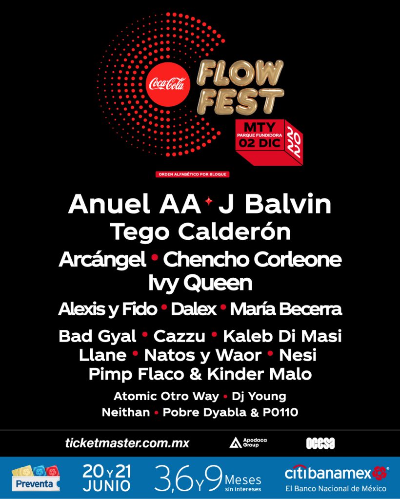 02 de diciembre – Parque Fundidora Venta Elite: 17 de junio Preventa Citibanamex: 20 y 21 de junio Venta libre: 22 de junio www.ticketmaster.com.mx En su quinta edición, el #CocaColaFlowFest22 toma el control del país y crece en todos los sentidos, expandiendo sus fronteras. Además de la Ciudad de México, el Coca-Cola Flow Fest